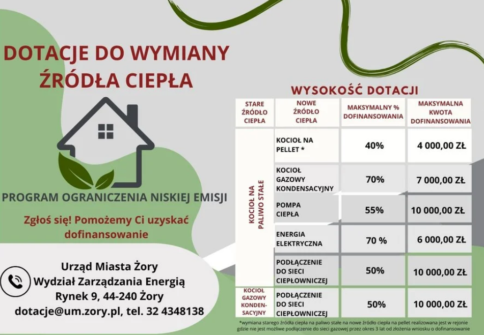 Urząd Miasta Żory prowadzi nabór wniosków o dofinansowanie na wymianę źródła ciepła w ramach Programu ograniczenia niskiej emisji dla Miasta Żory (PONE) w 2024 roku. Wnioski można składać do 30 kwietnia, a dofinansowanie może w sumie wynieść nawet 100% poniesionych kosztów!