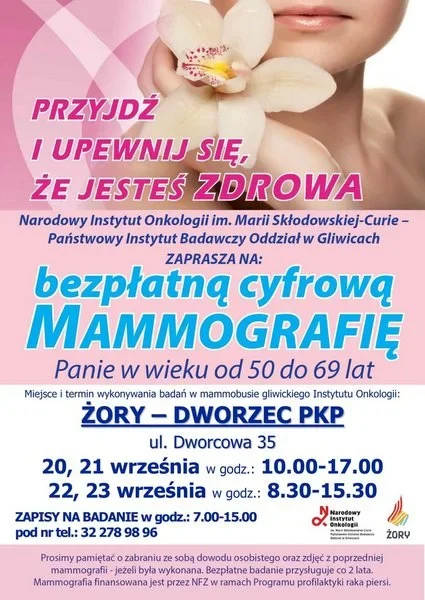 Kobiety w wieku 50-69 lat mogą bezpłatnie wykonać cyfrową mammografię w ramach Programu Profilaktyki Raka Piersi. Mammobus Narodowego Instytutu Onkologii im. M. Skłodowskiej-Curie w Gliwicach od wczoraj stoi przy żorskim dworcu kolejowym.