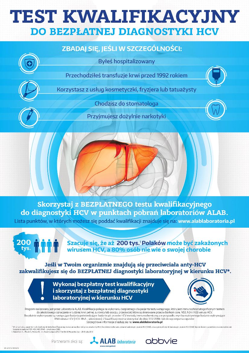 Wprowadzenie skutecznego leczenia pozwala na pozbycie się wirusa z krwi, dlatego teraz najważniejsze jest, by znaleźć tych, którzy nie są świadomi swojego zakażenia. Stanowią oni ryzyko dla innych, ponieważ mogą transmitować wirusa na kolejne osoby. Tymczasem wystarczy wykonać krótki i bezbolesny test, by przekonać się, że jesteśmy zdrowi. – Wykonanie testu polega na nakłuciu opuszka palca, pobraniu kropli krwi. Wynik będzie znany już po 15 minutach. Do badania nie trzeba się specjalnie przygotowywać. Wystarczy zgłosić się do jednego z ponad 170 punktów pobrań ALAB w wybranym mieście, w godzinach jego funkcjonowania. W przypadku wykrycia przeciwciał anty-HCV, bezpłatnie zostanie przeprowadzona pogłębiona diagnostyka –  mówi lek. med. Agata Strukow z ALAB laboratoria.
