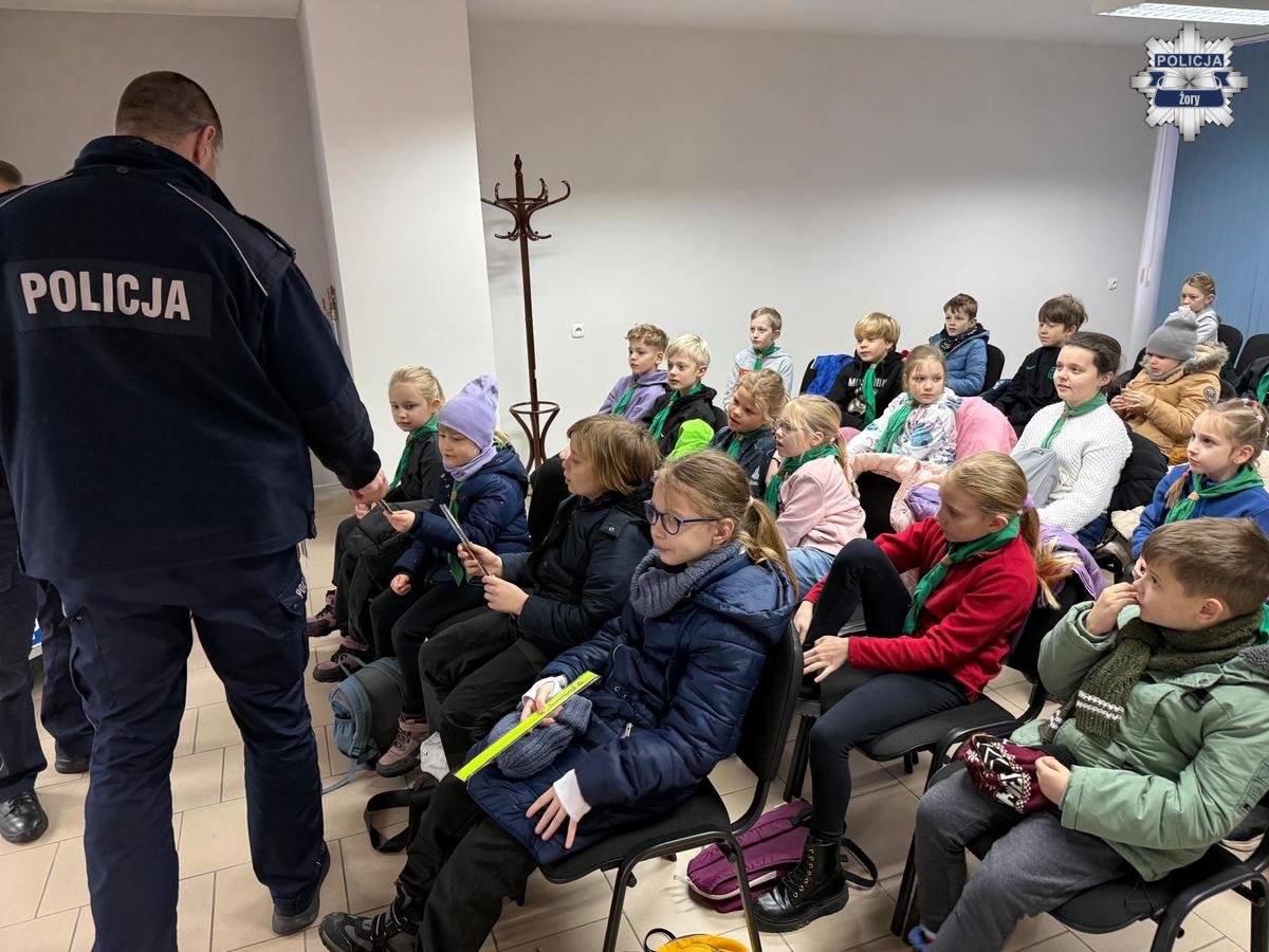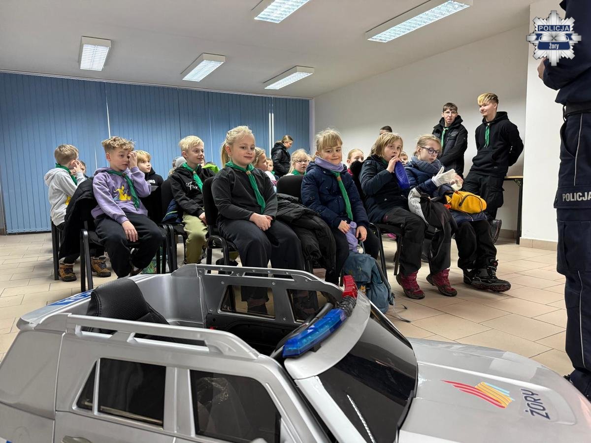 Komendę Miejską Policji w Żorach odwiedziły zuchy z XVI Gromady Zuchowej „Leśne Ludki”, które miały okazję z bliska poznać codzienną pracę policjantów. Wizyta odbyła się w ramach realizowanego zadania „Trop policjanta” i była nie tylko ciekawą przygodą, ale także ważną lekcją odpowiedzialności i bezpieczeństwa. O pracy policjantów i roli Policji opowiadał Marek Ryszka, Komendant Miejski Policji w Żorach. Podczas spotkania podkreślał, że służba w Policji to przede wszystkim misja, gotowość niesienia pomocy i troska o drugiego człowieka. Komendant mówił również o codziennych wyzwaniach, z jakimi mierzą się funkcjonariusze, oraz o znaczeniu odpowiedzialnych postaw – zarówno w służbie, jak i w życiu codziennym.