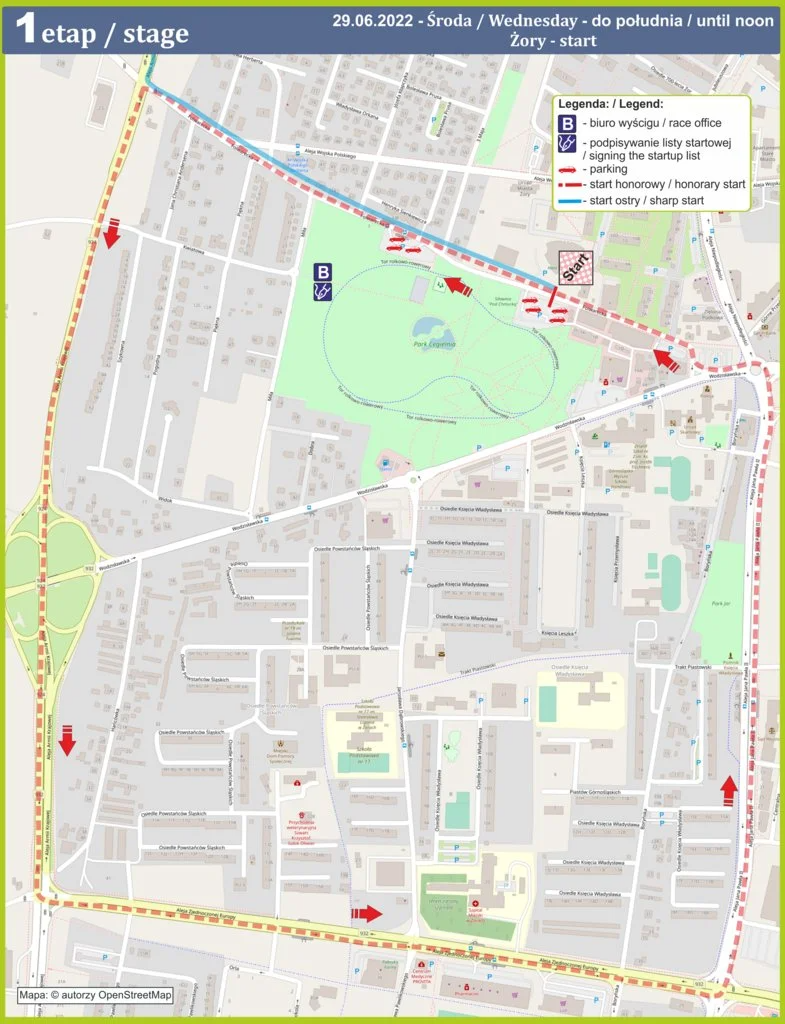 Kolarze ruszą spod hali MOSiR przy ul. Folwareckiej, następnie będą kierowali się Aleją Armii Krajowej w lewo, po czym skręcą w Aleję Zjednoczonej Europy. Dojadą do skrzyżowania z Aleją Jana Pawła II, gdzie skręcą w lewo i pojadą aż do skrzyżowania z ul. Wodzisławską i dalej pod halę MOSiR. Na wysokości hali sportowej zaplanowano start ostry. Peleton dojedzie do Alei Armii Krajowej, gdzie skręci w prawo i będzie kierował się do ul. Na Rudą, skąd kolarze pojadą ul. Pszczyńską w kierunku Rudziczki, a następnie skręcą w lewo na Orzesze – Zgoń. Meta 1 etapu zlokalizowana jest w Katowicach.