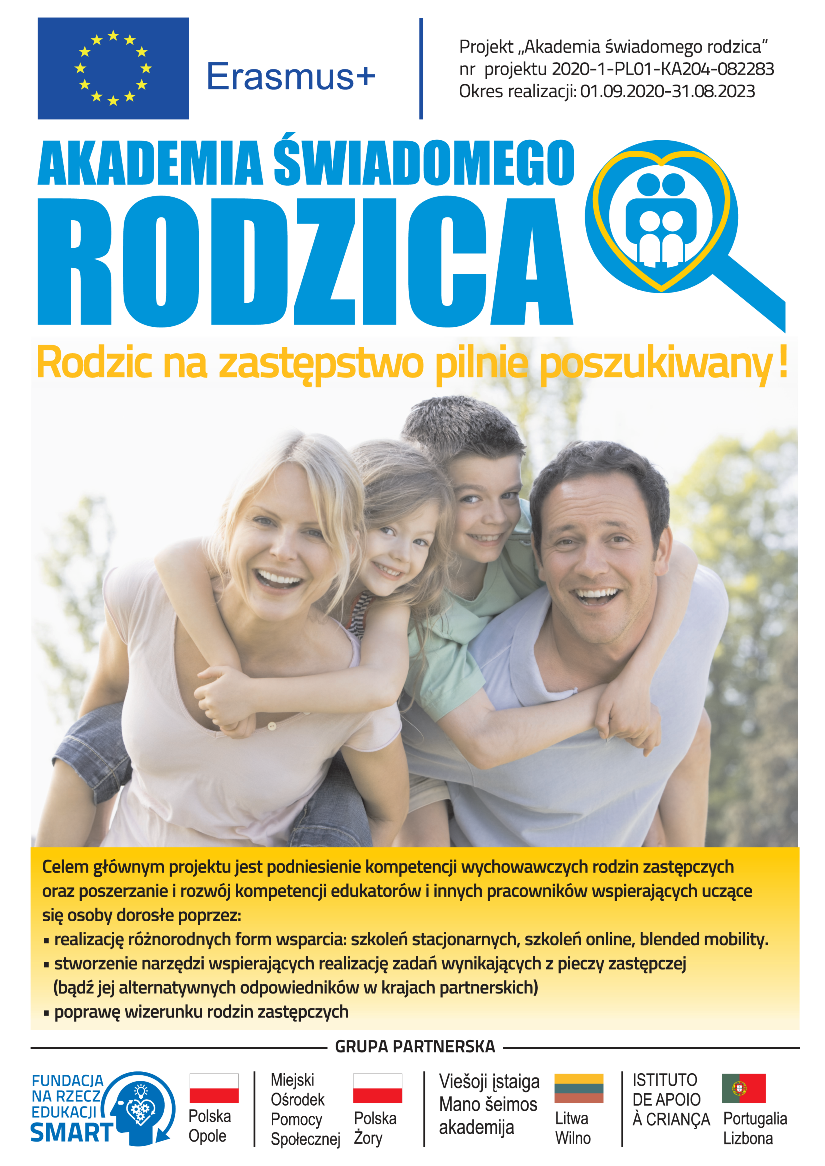 Rodzic na zastępstwo pilnie poszukiwany!” jest realizowany od 1 września 2020 r. do 31 sierpnia 2023 r. Na realizację tego projektu Miejski Ośrodek Pomocy Społecznej w Żorach pozyskał dofinansowanie w wysokości 27 383,00 euro z unii europejskiej w ramach programu Erasmus+. Realizatorem projektu jest Fundacja na rzecz edukacji SMART z Opola, a organizacjami partnerskimi w tym projekcie oprócz MOPS w Żorach są: Nstituto De Apoio À Criança z Portugali i VieĄoji Įstaiga Mano Šeimos Akademija z Litwy.