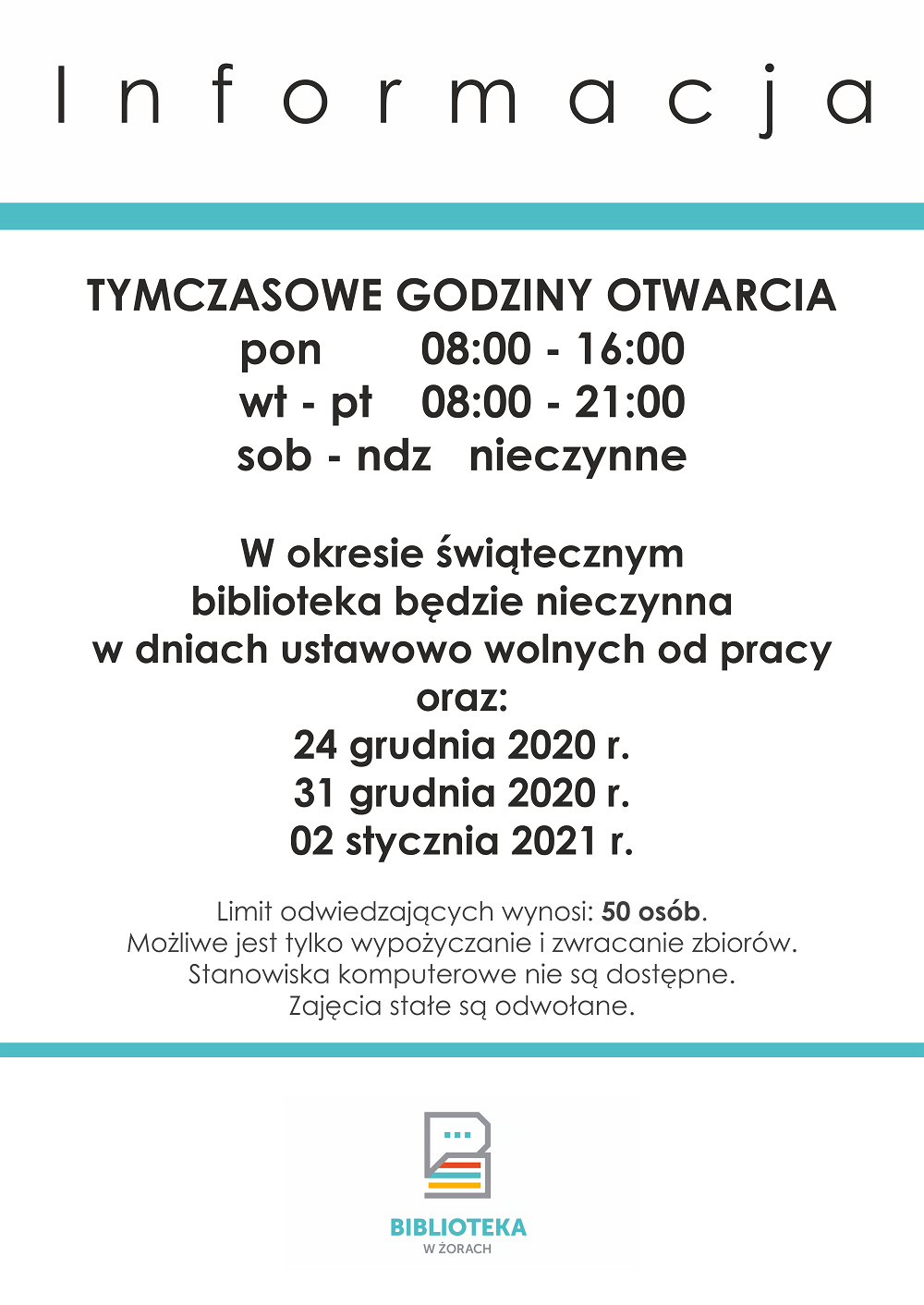 W okresie świątecznym biblioteka będzie nieczynna w dniach ustawowo wolnych od pracy oraz 24, 31 grudnia i 2 stycznia 2021 r.
