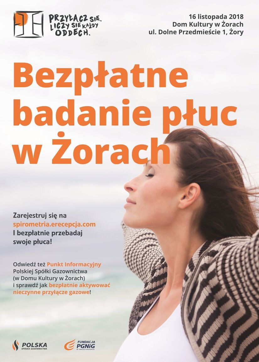 Organizatorzy akcji „Przyłącz się, liczy się każdy oddech” zapraszają również na bezpłatne badania spirometryczne. Odbędą się one także w piątek, 16 listopada w godzinach od 10:00 – 16:00 w Domu Kultury w Żorach, ul. Dolne Przedmieście 1. Aby wziąć w nich udział wystarczy zarejestrować się na stronie spirometria.erecepcja.com