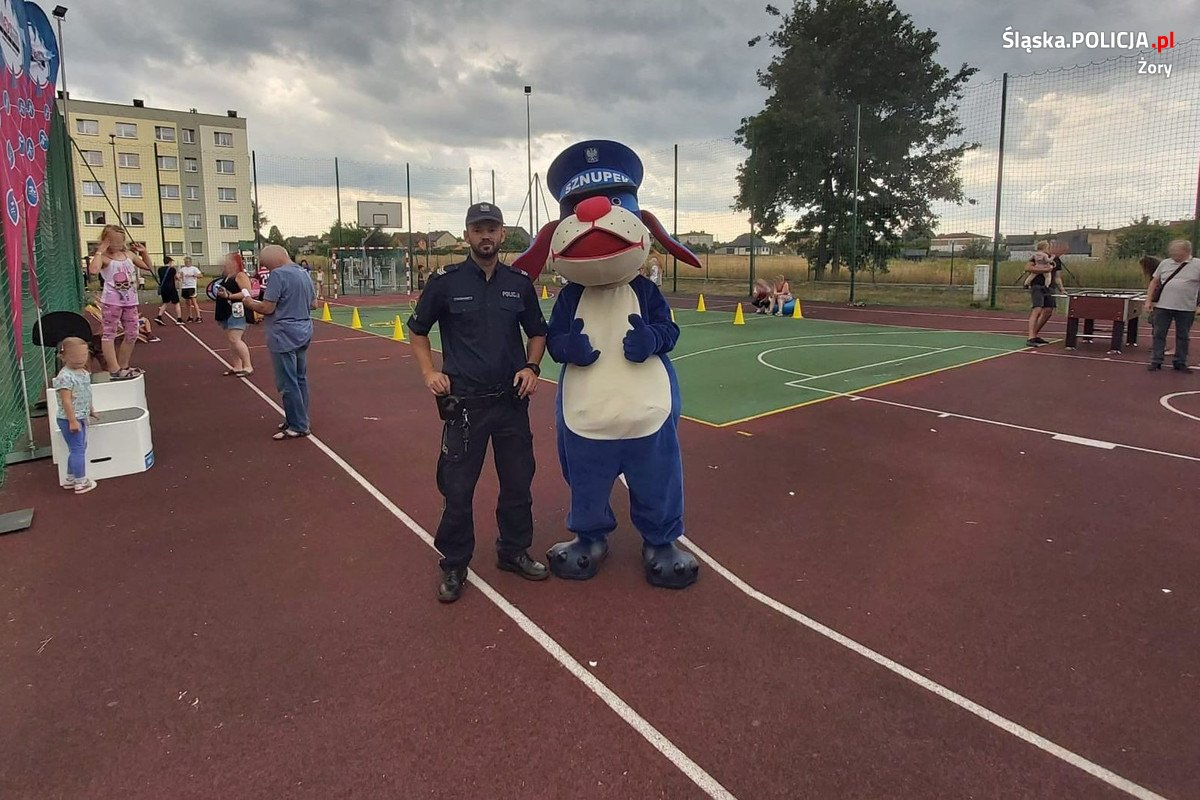 Dzielnicowy sierż. szt. Konrad Kucharski wraz z maskotką Śląskiej Policji - Sznupkiem wzięli udział w przygotowanym programie rekreacyjno-sportowym przez Miejski Ośrodek Sportu i Rekreacji w Żorach. Prócz możliwości uczestnictwa w szeregu konkurencji sportowych, spotkanie to stanowiło okazję do porozmawiania o bezpieczeństwie czasu wolnego, problemach dzielnicy, a także osobistego spotkania z dzielnicowym.