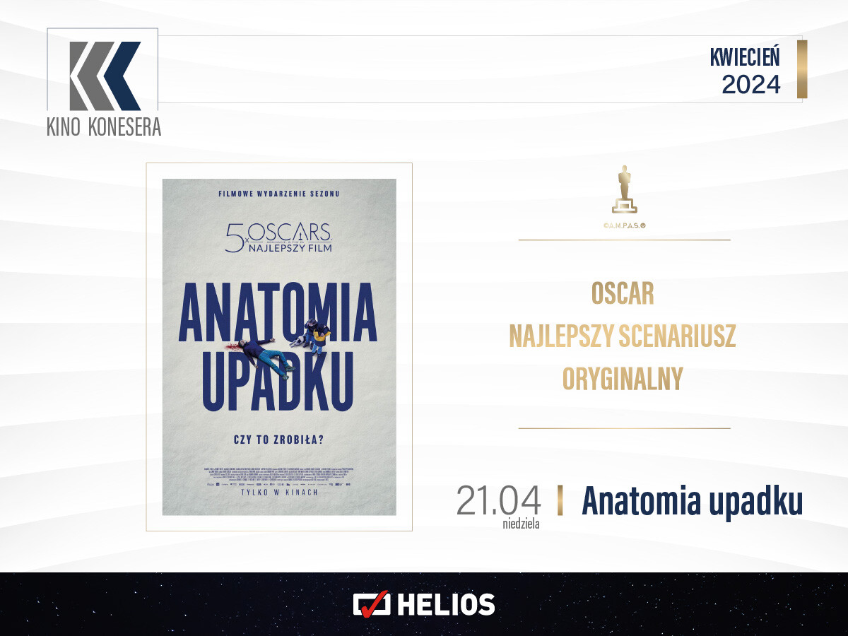 Cykl Kino Konesera pojawi się w nadchodzącym tygodniu aż dwukrotnie. 21 kwietnia po raz ostatni do kin zawitają seanse oscarowe, w ramach których zostanie wyświetlona „Anatomia upadku”, nagrodzona statuetką za najlepszy scenariusz oryginalny. Następnie w poniedziałek, 22 kwietnia, kinomani będą mogli obejrzeć poruszający film „Dobrzy nieznajomi”. Opowiada on historię Adama, który niespodziewanie trafia do rodzinnego domu, gdzie odkrywa, że zmarli rodzice żyją tam dokładnie tak jak przez 30 laty.