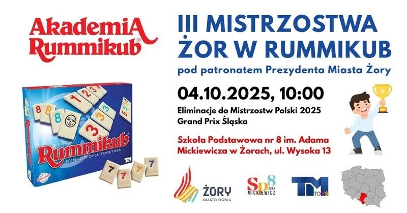 4 października 2025 odbędą się III Mistrzostwa Żor w Rummikub. Udział mogą wziąć osoby w wieku od 5 do 99 lat. Nagrody, awans na Mistrzostwa Województwa i punkty do ogólnopolskiego rankingu!