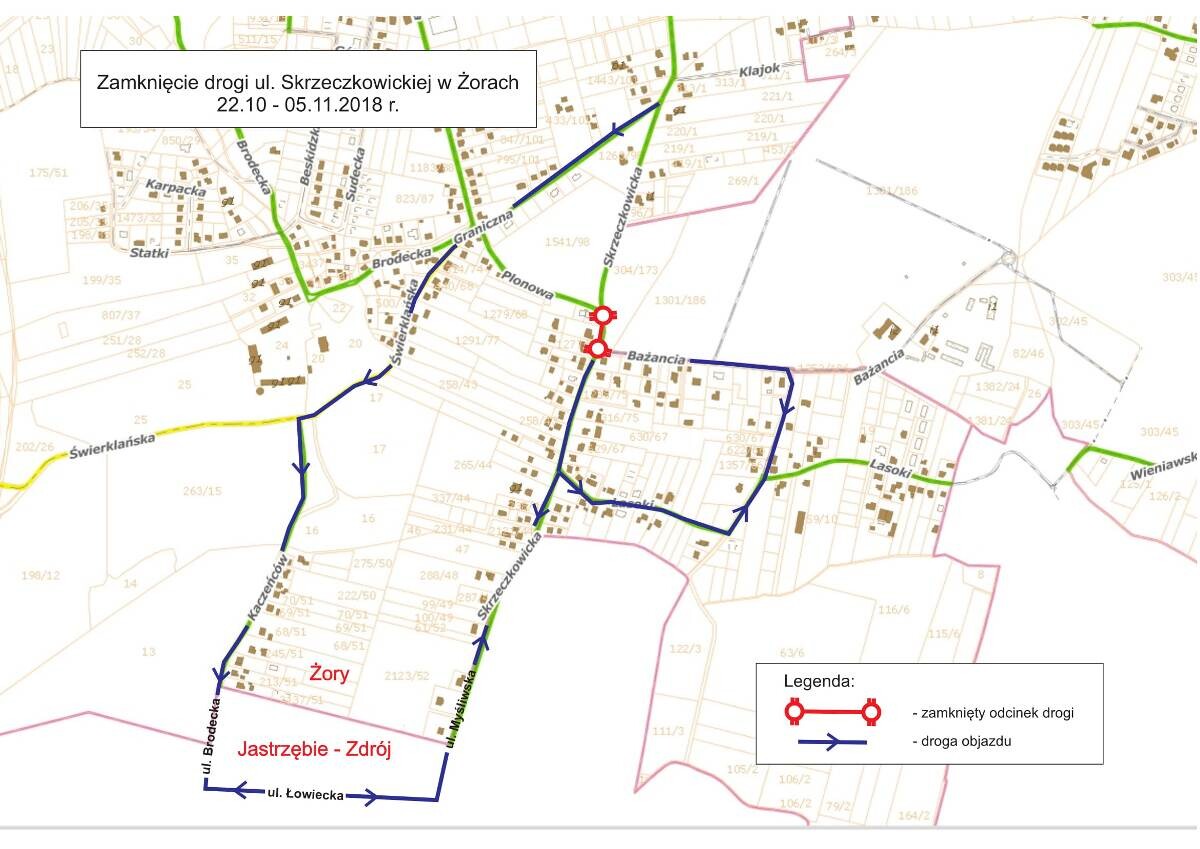 Na czas prowadzenia prac wprowadzony zostaje objazd ulicami: Graniczną, Świerklańską, Kaczeńców, następnie drogami na terenie Jastrzębia-Zdroju tj. ulicami: Brodecką, Łowiecką i Myśliwską do ul. Skrzeczkowickiej w Żorach.