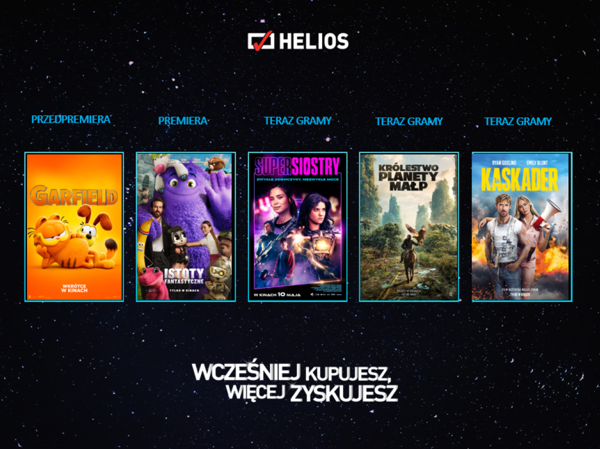 W kinach Helios widzowie mogą liczyć na szeroki wybór produkcji dla kinomanów w różnym wieku. „Ucieczka ze zwierzowersum” to australijska animacja o wombatce Maggie, która pomaga innym w codziennych zadaniach. Niespodziewanie staje przed wielkim wyzwaniem: ocalić swoje miasto przed szalonym naukowcem, pragnącym uwięzienie mieszkańców w komputerowej symulacji. Inną animowaną propozycją jest kinowy przebój „Kung Fu Panda 4”, czyli kontynuacja lubianej na całym świecie serii. Polskim tytułem familijnym jest natomiast film „Supersiostry” – opowieść o odnalezionym po latach rodzeństwie, Ali i Lenie, która odkrywają w sobie nadprzyrodzone zdolności. Dziewczyny będą musiały połączyć siły, aby stawić czoła bezwzględnym wysłannikom wojska, chcącym stworzyć broń nowej generacji.