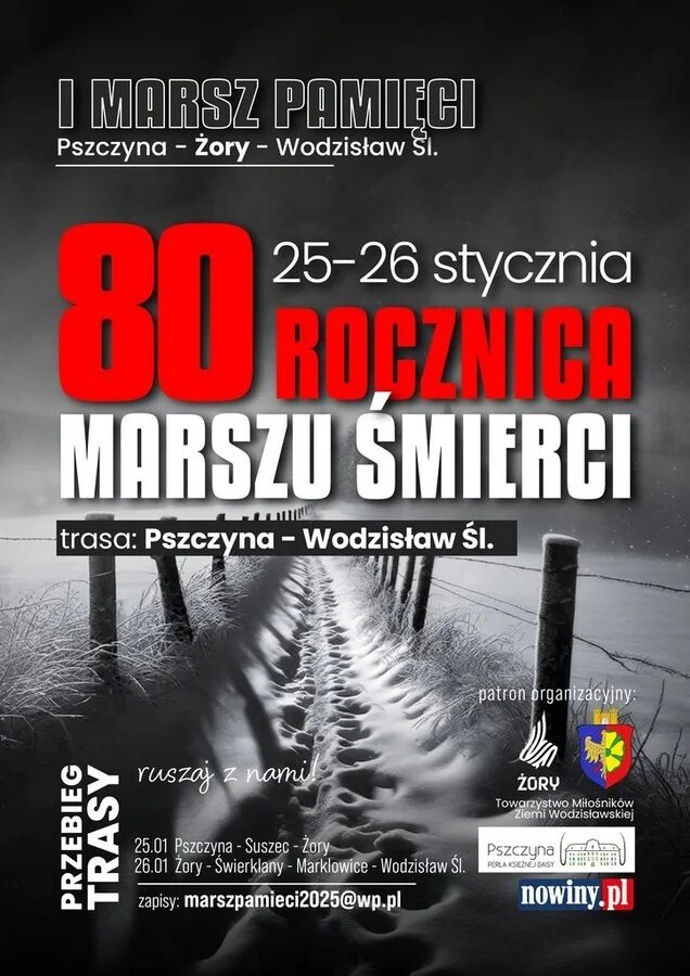 Marsze Śmierci w tragiczny sposób odcisnęły się na kartach historii, również naszego miasta. Aby uczcić pamięć o ofiarach oraz oddać hołd wszystkim tym, którzy przetrwali to niewyobrażalne okrucieństwo, na trasie Pszczyna - Żory - Wodzisław Śląski w dniach 25-26 stycznia 2025 r. przejdzie Marsz Pamięci.