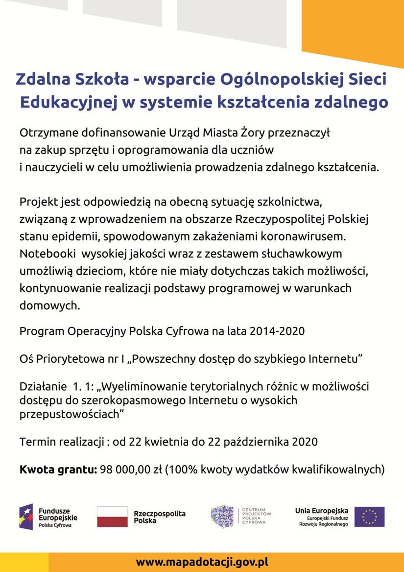 Projekt pn. „Zdalna Szkoła - wsparcie Ogólnopolskiej Sieci Edukacyjnej w systemie kształcenia zdalnego” jest finansowany ze środków Programu Operacyjnego Polska Cyfrowa na lata 2014-2010, Oś Priorytetowa nr I „Powszechny dostęp do szybkiego Internetu”, Działanie 1. 1: „Wyeliminowanie terytorialnych różnic w możliwości dostępu do szerokopasmowego Internetu o wysokich przepustowościach”.
