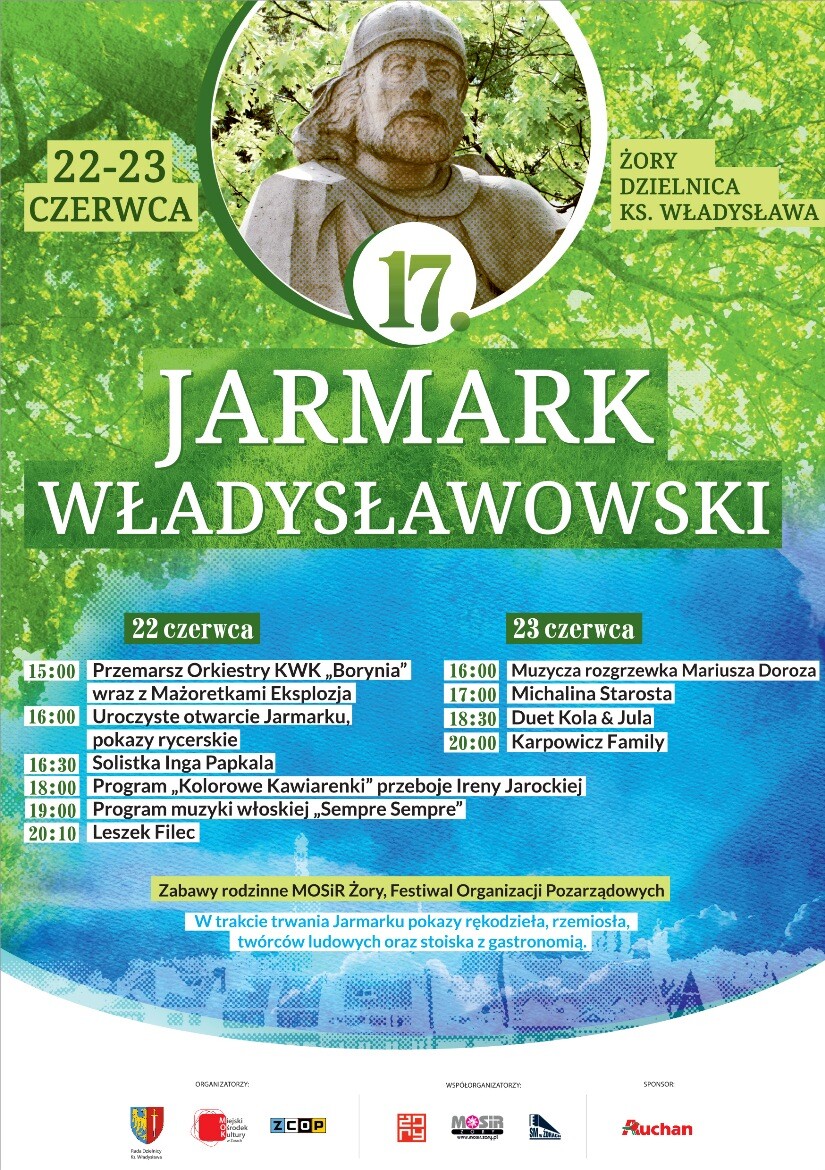 17. Jarmark Władysławowski rozpocznie się w sobotę, 22 czerwca od przemarszu Orkiestry KWK „Borynia” wraz z występami Mażoretek „Eksplozja” z klubu MOK „Wisus”. Uroczyste otwarcie imprezy odbędzie się o godzinie 16:00, a wśród atrakcji znajdą się: pokazy rycerskie, występ solistki Ingi Papkali, program „Kolorowe Kawiarenki” z przebojami Ireny Jarockiej oraz program muzyki włoskiej „Sempre, Sempre”. Gwiazdą wieczoru będzie Leszek Filec, które przeboje podbijają „Listę Śląskich Szlagierów”. Początek koncertu o godz. 20:10.
