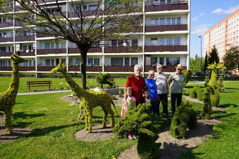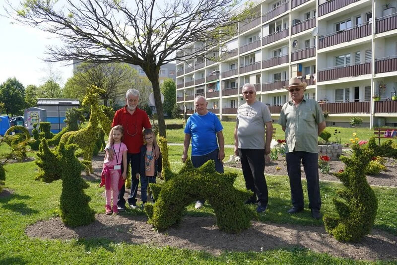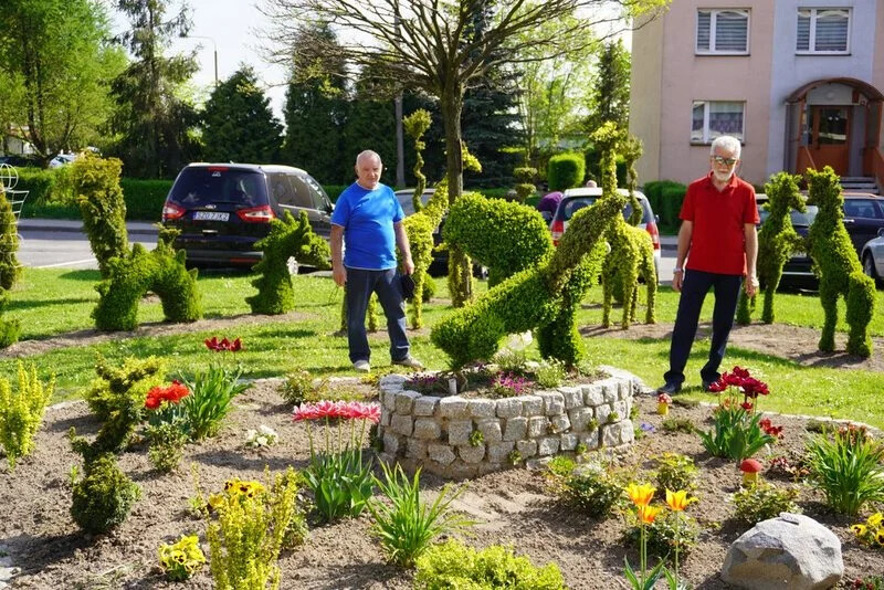 To wszystko możemy zobaczyć w magicznym ogrodzie stworzonym przez mieszkańców osiedla Pawlikowskiego w Żorach, pomiędzy blokami o numerach 7 i 8. Niezwykłe zielone rzeźby tworzą z krzewów oraz pielęgnują mieszkańcy bloku nr 7: Czesław Tomala, Jan Kopacz, Jerzy Błuszko, Marian Harasiuk oraz Jan Staniszewski.