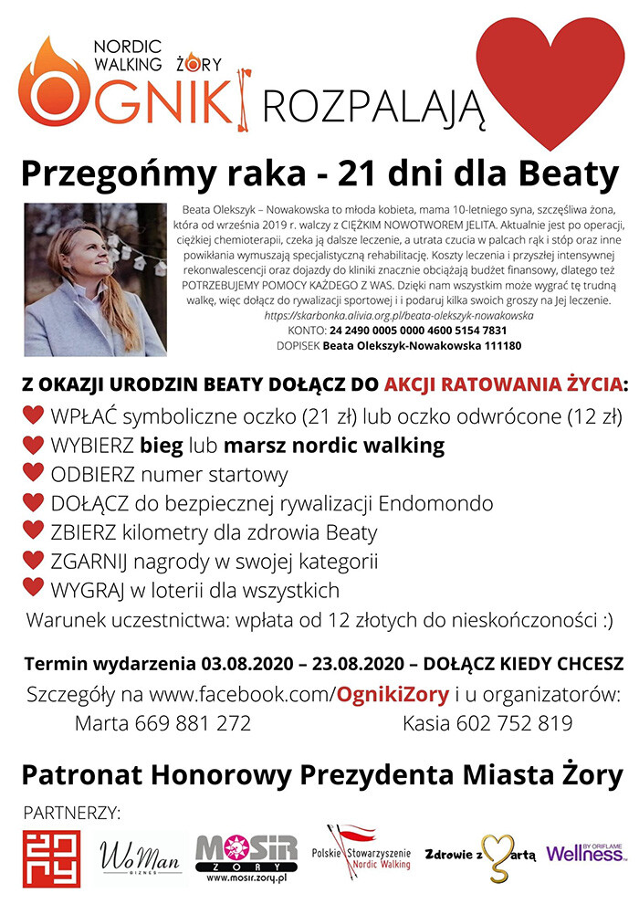 Beata Olekszyk – Nowakowska to młoda kobieta, mama 10-letniego syna, szczęśliwa żona, która od września 2019 r. walczy z CIĘŻKIM NOWOTWOREM JELITA. Aktualnie jest po operacji, ciężkiej chemioterapii, czeka ją dalsze leczenie, a utrata czucia w palcach rąk i stóp oraz inne powikłania wymuszają specjalistyczną rehabilitację.