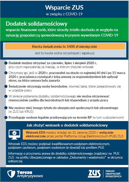 Tylko do końca sierpnia osoby, które straciły pracę z powodu epidemii koronawirusa mogą wystąpić do ZUS o dodatek solidarnościowy.