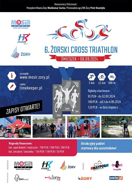 MOSiR w Żorach serdecznie zaprasza do udziału w kolejnych ekscytujących zawodach triathlonowych, które odbędą się 8 września 2024 r. – trwają zapisy na szóstą edycję Żorskiego Cross Triathlonu! Start zaplanowany jest na godzinę 10:30 przy Kąpielisku „Śmieszek” w Żorach.