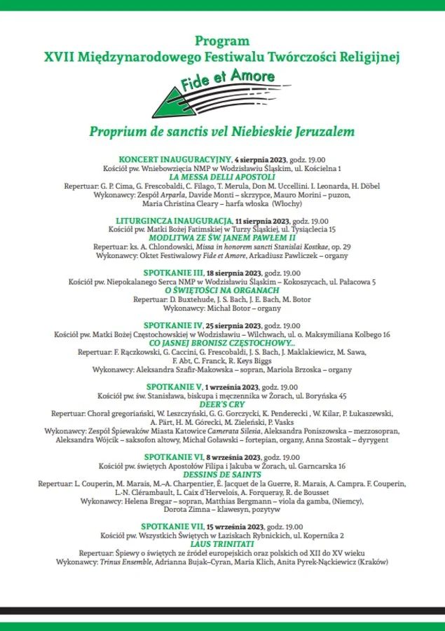 Kompletny program Festiwalu można znaleźć na stronie fideetamore.zory.pl. Honorowy Patronat nad wydarzeniem objął Prezydent Miasta Żory Waldemar Socha.