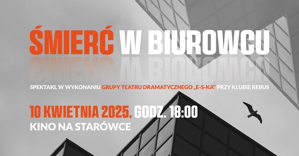 Miejski Ośrodek Kultury w Żorach zaprasza na najnowszy spektakl Teatru Dramatycznego „e-S-ka” przy Klubie Rebus – „Śmierć w biurowcu”! To kryminalna komedia, która rozbawi Was do łez, a jednocześnie przyprawi o dreszcze! Tajemnicza zbrodnia, agentki ubezpieczeniowe z ambicjami FBI i pełna huśtawka nastrojów – tak zapowiada się wieczór pełen emocji!