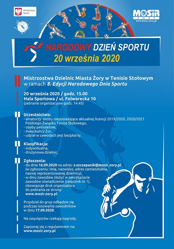 Narodowy Dzień Sportu to ogólnopolska kampania, której celem jest zachęcenie Polaków do aktywnego życia, pełnego sportowych wyzwań i dobrej kondycji. W ramach akcji, w różnych zakątkach Polski odbywają się bezpłatne wydarzenia i treningi. W Żorach, miłośnicy sportu będą mieli okazję zmierzyć się w Mistrzostwach Dzielnic w Tenisie Stołowym. Amatorskie rozgrywki to doskonała szansa na aktywne spędzenie wolnego czasu, a rywalizacja pomiędzy dzielnicami z pewnością zmotywuje uczestników do walki o zwycięstwo.