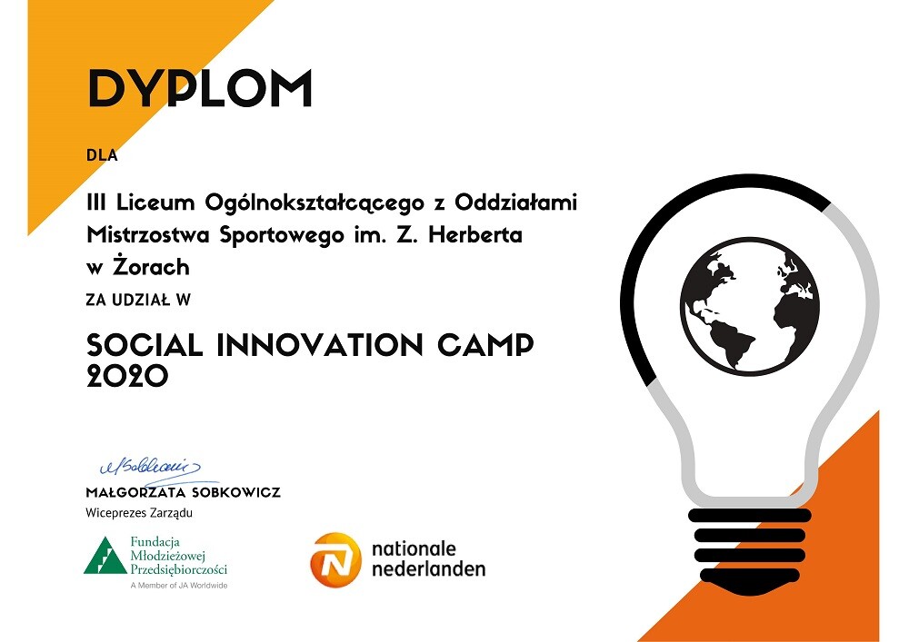 Pierwszego grudnia pięcioro uczniów III Liceum Ogólnokształcącego im. Zbigniewa Herberta w Żorach uczestniczyło w Ogólnopolskim Konkursie Social Innovation Camp online na najlepsze uczniowskie innowacje społeczne.