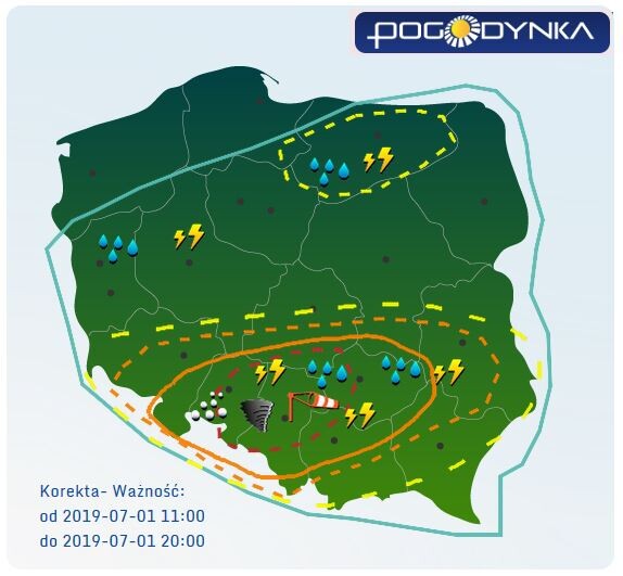 Dzisiejsze warunki meteorologiczne prowadzić mogą do rozwoju dobrze zorganizowanych i rozbudowanych komórek burzowych. Mogą to być zarówno superkomórki burzowe - zwłaszcza w pierwszej, izolowanej fazie rozwoju burz, ale także układy burzowe z segmentami szkwałowymi. Istnieje ryzyko wystąpienia trąb powietrznych - czytamy w komunikacie IMGW.