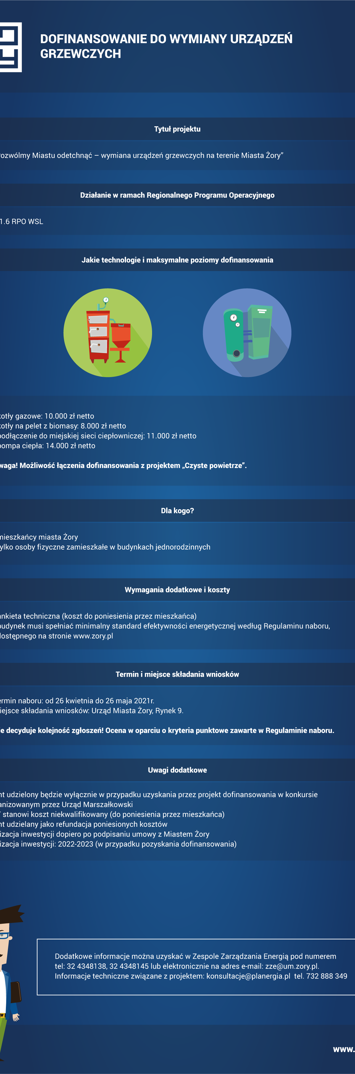 Dlatego Urząd Miasta Żory ogłasza nabór do projektu grantowego, umożliwiającego pozyskanie dotacji na wymianę kotłów niespełniających zapisów tzw. uchwały antysmogowej (kotły pozaklasowe i kotły klasy 3 wg normy PN-EN 303-5:2012). Projekt będzie realizowany w tzw. „formule grantowej”, gdzie przygotowanie dokumentacji aplikacyjnej będzie po stronie Miasta Żory, zaś mieszkańcy chętni do wzięcia udziału w projekcie będą składali wnioski bezpośrednio do Urzędu Miasta. Po uzyskaniu dofinansowania z Urzędu Marszałkowskiego (koniec roku 2021), wybór wykonawcy oraz nadzór nad realizacją inwestycji będą należały już do mieszkańca.