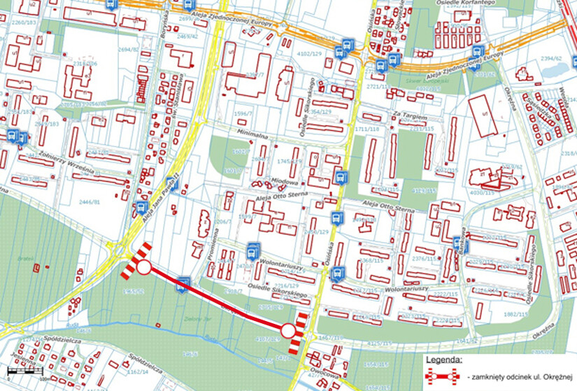 W godzinach od 9:00 – 14:00 na części ulicy Okrężnej układana będzie warstwa asfaltowa ścieralna. Dlatego w tym czasie odcinek od skrzyżowania z Aleją Jana Pawła II do skrzyżowania z ul. Osińską będzie całkowicie wyłączony z ruchu.