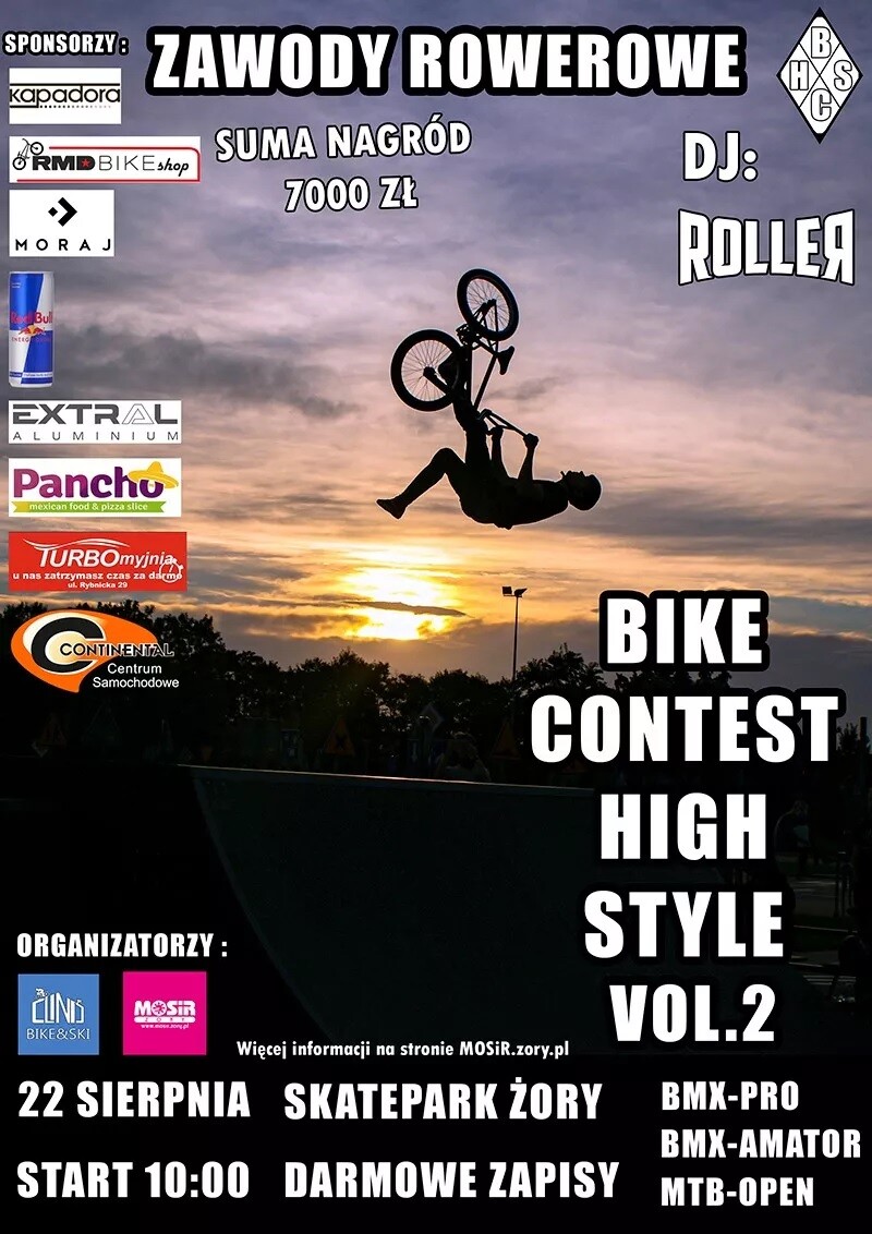 Wysokie loty i efektowne ewolucje na rowerach BMX i MTB będzie można oglądać w Żorach! Na skateparku w Parku Cegielnia odbędzie się druga edycja zawodów rowerowych „Bike Contest High Style Vol. 2”. Zapisy w dniu imprezy, a pula nagród to aż 7 000 zł!
