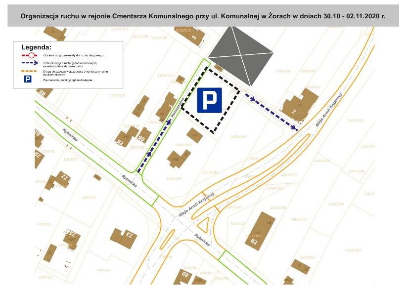 Wprowadza się ruch jednokierunkowy na ul. Komunalnej. Wjazd na parking przy cmentarzu będzie możliwy od ul. Rybnickiej, natomiast wyjazd w stronę al. Armii Krajowej.
