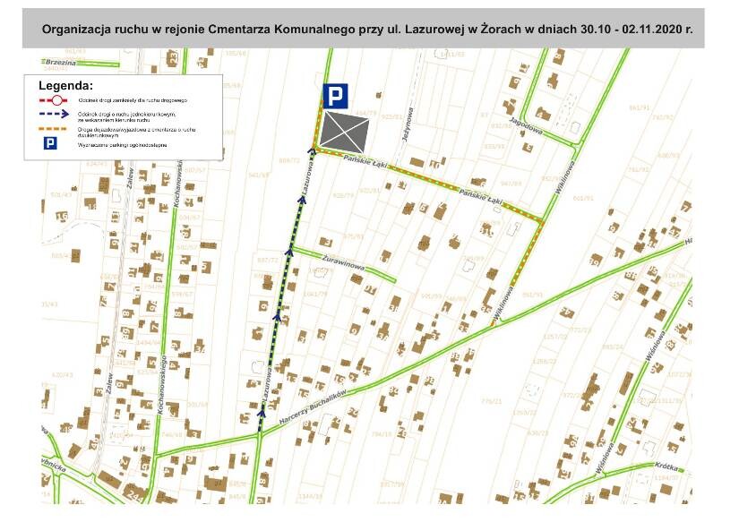 Wprowadza się ruch jednokierunkowy na odcinku ul. Lazurowej od skrzyżowania z ul. Harcerzy Buchalików do skrzyżowania z ul. Pańskie Łąki. Dojazd do cmentarza będzie możliwy ul. Lazurową bądź ul. Pańskie Łąki, natomiast wyjazd z cmentarza będzie możliwy ul. Pańskie Łąki, następnie ul. Wiklinową do ul. Harcerzy Buchalików i do ul. Lazurowej.