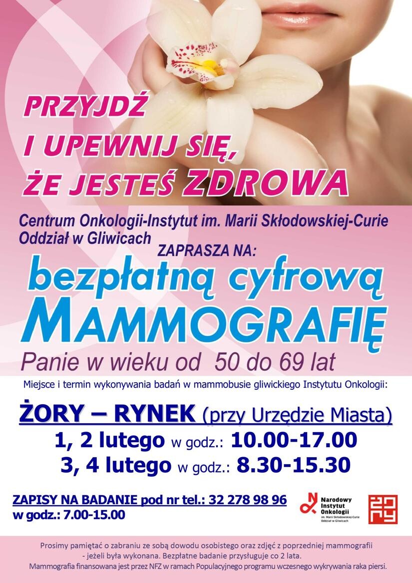 Badania są skierowane do pań w wieku 50-69 lat. Mobilna pracownia mammograficzna będzie do dyspozycji Pań 1,2 lutego w godzinach od 10.00 do 17.00 oraz 3,4 lutego w godzinach od 8:30 do 15:30 na żorskim Rynku przy Urzędzie Miasta.
