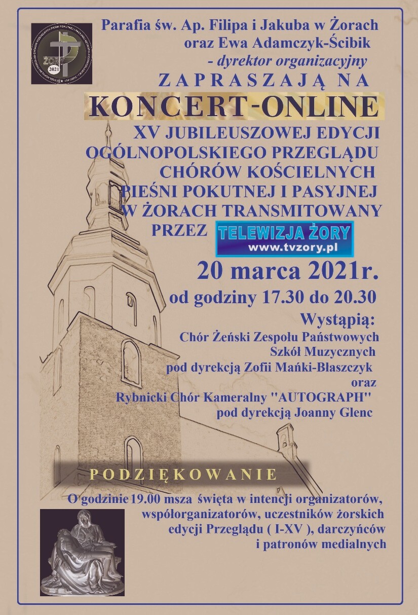 Koncert finałowy XV jubileuszowej edycji Ogólnopolskiego Przeglądu Chórów Kościelnych Pieśni Pokutnej i Pasyjnej w Żorach odbędzie się w formule online. Początek w najbliższą sobotę, 20 marca o godzinie 17:30.