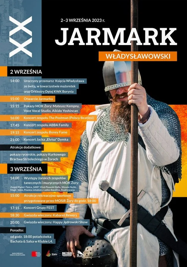 XX Jarmark Władysławowski rozpocznie się w sobotę, 2 września o godz. 14:00 od przemarszu Księcia Władysława ze świtą, w towarzystwie mażoretek oraz Orkiestry Dętej KWK Borynia przez całą dzielnicę. Następnie o godz. 15:00 odbędzie się uroczyste rozpoczęcie Jarmarku, po którym wystąpią dla nas utalentowani wychowankowie MOK Żory: Mateusz Kempny, Voce Vocal Studio oraz Aikido Yoshincan. Następnie rozpocznie się prawdziwa muzyczna uczta w klimacie znanych i lubianych przebojów lat 60’, 70’ i 80’ minionego wieku. Na początek, o godz. 16:00 zagrają dla nas Polscy Beatlesi, czyli zespół The Postman. Następnie o godz. 17:45 będziemy mogli posłuchać największych przebojów grupy ABBA w wykonaniu zespołu ABBA Family. Po subtelności ABBY czas na żywiołowość Boney M. Najpopularniejsze hity tego zespołu wykona grupa Boney Fame. Początek koncertu o godz. 19:15. Imprezę zakończą przeboje króla rock'n'rolla, czyli Elvisa Presleya w wykonaniu Jacka „Elvisa” Dymka! W tym dniu zaplanowano także pokazy rycerskie oraz prezentacje broni palnej, przygotowane przez Kurkowe Bractwo Strzeleckie w Żorach.