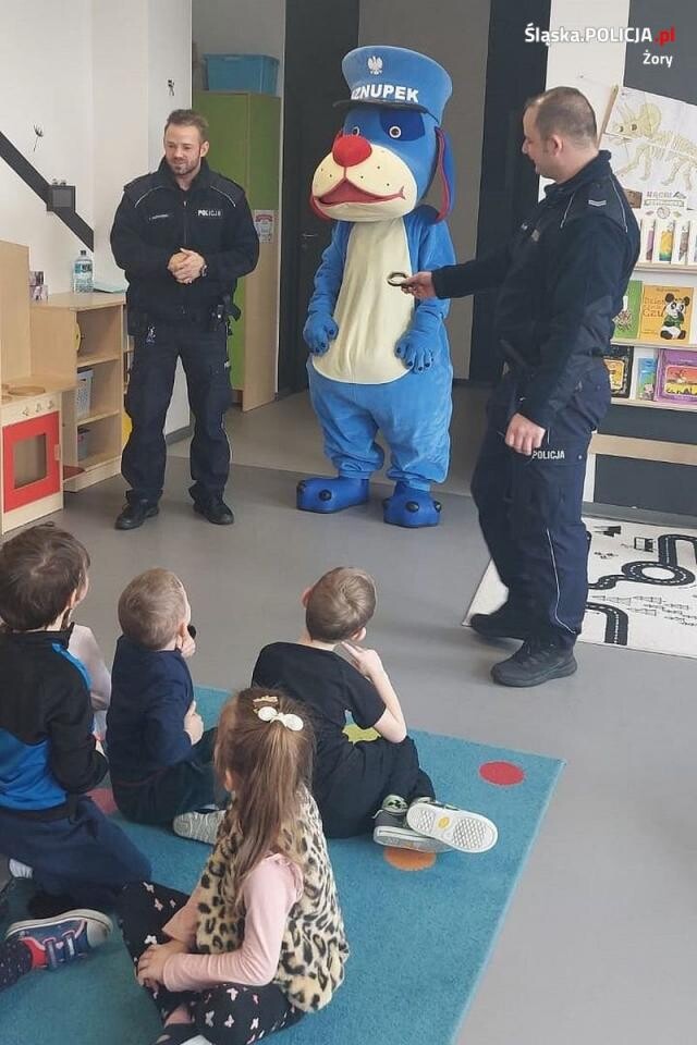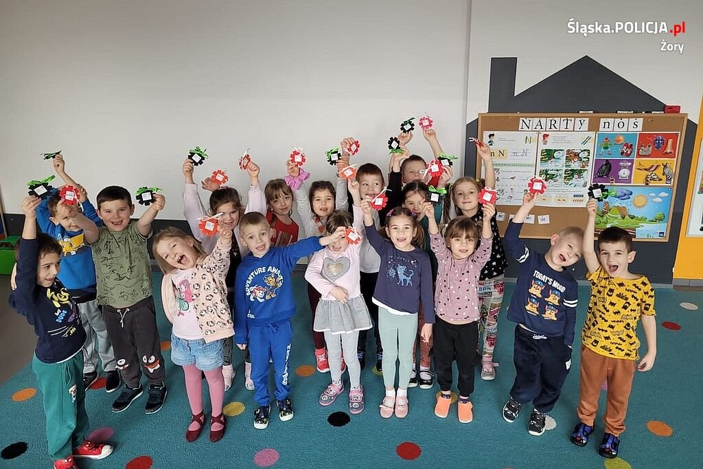Wczoraj na żorskich drogach można było spotkać mundurowych ze specjalnie przygotowanymi kwiatkami. Twórcami podarunków były dzieci z Przedszkola nr 8 w Żorach, które w poniedziałek odwiedzili żorscy dzielnicowi: sierż. szt. Konrad Kucharski oraz st. sierż. Dawid Góra oraz maskotka Śląskiej Policji - Sznupek.