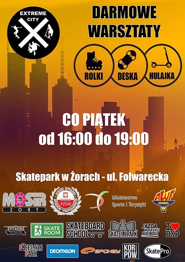 Warsztaty „Extreme City” rozpoczną się 6 lipca na terenie żorskiego skateparku w Parku Cegielnia i będą kontynuowane w każdy piątek wakacji w godzinach od 16:00 do 19:00. Udział w zajęciach jest bezpłatny.