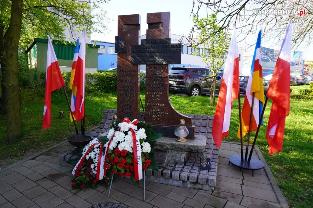 Z tej okazji przedstawiciele Urzędu Miasta Żory - Pani Karina Kostka - Naczelnik Wydziału Organizacyjnego Urzędu Miasta Żory i Tadeusz Michalski — Kierownik Wydziału Zarządzania Kryzysowego i Spraw Gospodarczych Urzędu Miasta Żory, a także żorskiej komendy Policji: inspektor Mariusz Klepek - Komendant Miejski Policji w Żorach oraz aspirant Marcin Leśniak - oficer prasowy Komendy Miejskiej Policji w Żorach złożyli hołd i kwiaty przy pomniku Pomordowanych w Katyniu Policjantów i Oficerów Wojska Polskiego.