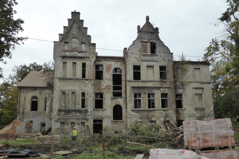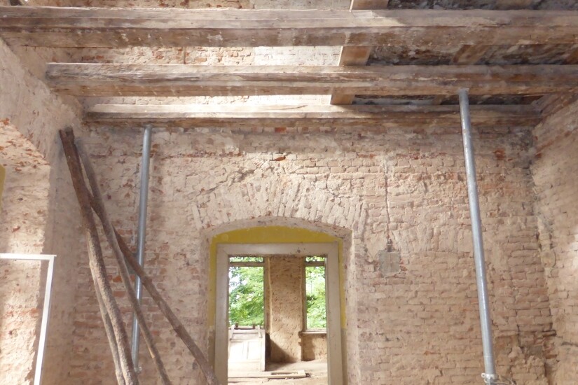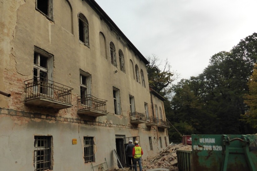 W budynku wykonano także roboty rozbiórkowe drewnianych podłóg, elementów drewnianych stropów, elementów ścian oraz fragmentów podłóg betonowych. Rozebrano zabytkowe kafle pod konstrukcję windy i skuto tynki wewnętrzne. Wykuto nowe otwory w ścianach, a także zamontowano naproża nad nowymi przebiciami i otworami drzwiowymi wewnątrz Pałacu. Ponadto rozebrano elementy posadzek i drewnianych stropów. Wzmocniono ściany za pomocą ściągów stalowych i tymczasowych oraz poprzez kotwienie. Wykonano wieńce żelbetowe w ścianach dla podparcia nowych stropów. Uzupełniono ubytki w ścianach oraz przemurowano i wyczyszczono przewody kominowe. Z budynku usunięto też gruz, który został już wywieziony. Obecnie trwają prace związane z wykonaniem stropów żelbetowych oraz odwodnieniem drogi pożarowej.