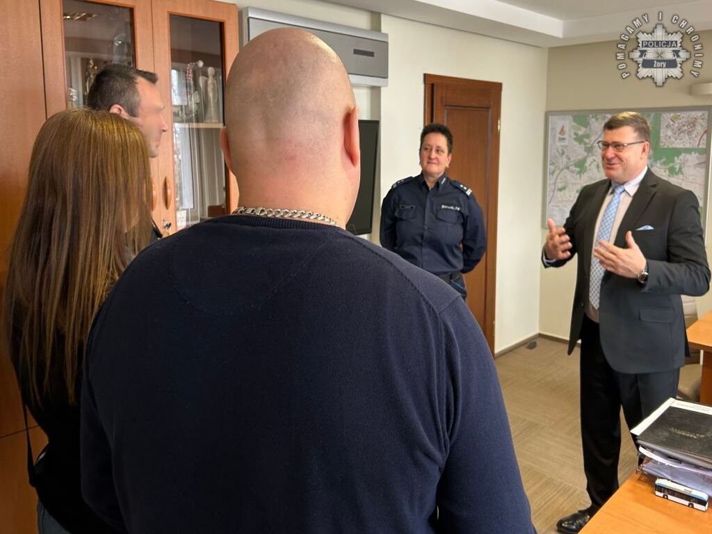 Podczas uroczystości mł. insp. Agata Głowacka i Zastępca Prezydenta Miasta Żory podziękowali bohaterom za ich zaangażowanie. Wręczyli im także miejskie upominki, podkreślając, że ich postawa powinna być wzorem do naśladowania dla innych mieszkańców.