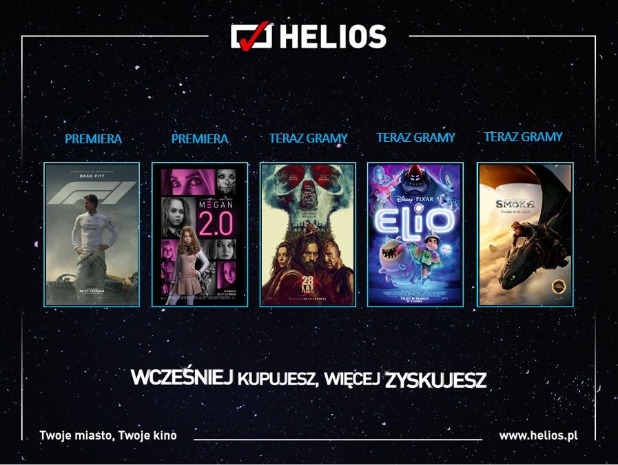 Filmowe emocje to doskonały pomysł na niezapomniany czas w gronie rodziny oraz przyjaciół. Szczegóły dotyczące najbliższych seansów oraz bilety na pokazy można znaleźć na stronie www.helios.pl, w aplikacji mobilnej oraz w kasach kinowych w całej Polsce. Dokonując zakupu wcześniej, można wybrać najlepsze miejsca, a także – zaoszczędzić w ramach oferty „Wcześniej kupujesz, więcej zyskujesz”.